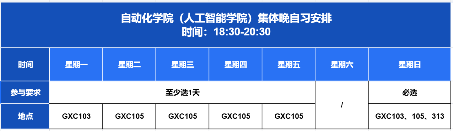 参与要求:每名同学每周至少参与2次集体自习(周日必选)